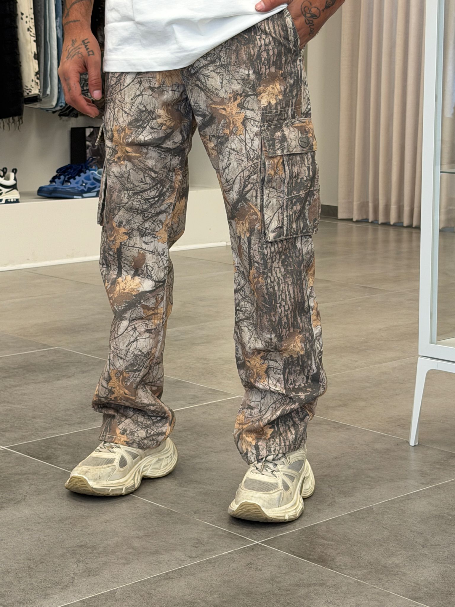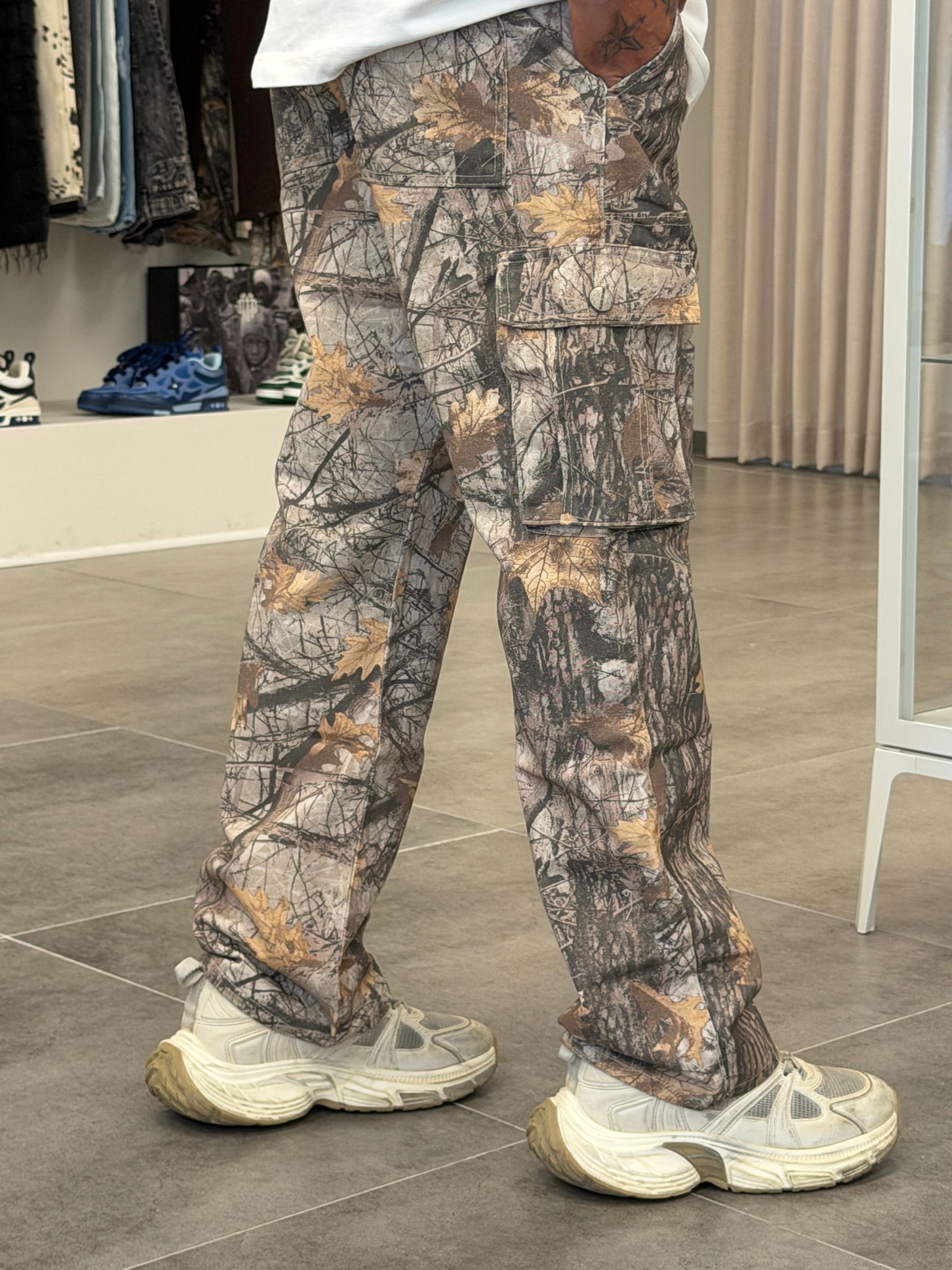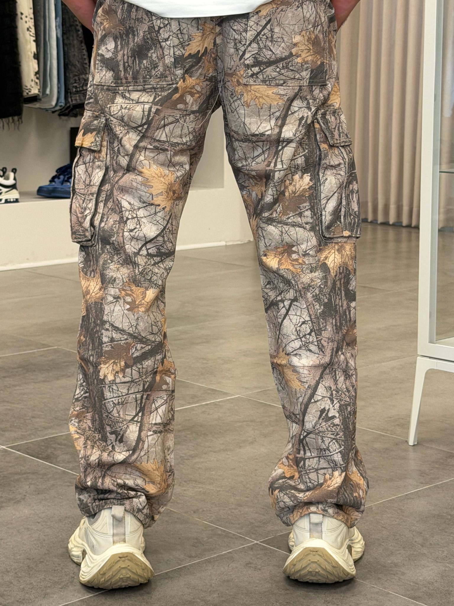 מכנסי קארגו בגזרה רחבה עם הדפס יער טבעי בסגנון forest camouflage — שילוב של גווני חום, אפור וירוק שיוצרים מראה ייחודי ועשיר בפרטים.