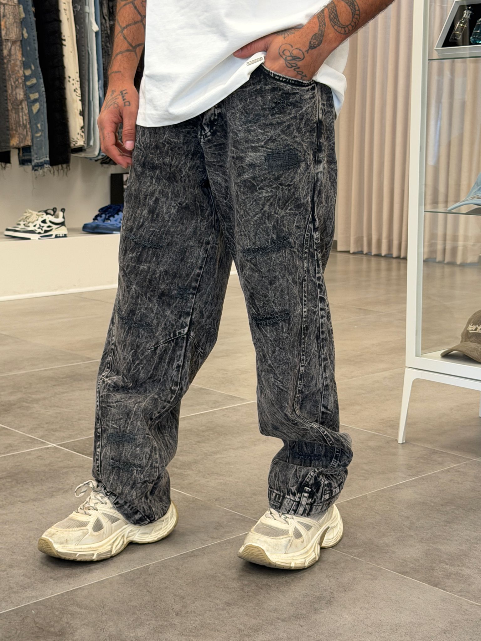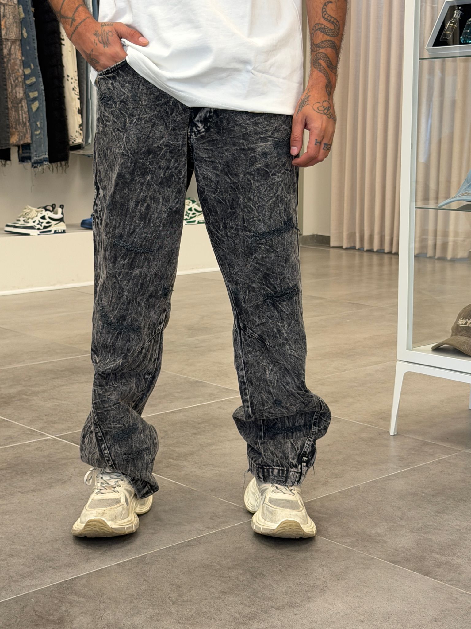 מכנסי אוברסייז בגוון אפור־שחור עם טקסטורת acid wash ייחודית המדמה אפקט של סופת גשם — שילוב בין קשיחות עירונית ליוקרה מודרנית. עשויים מבד כותנה עבה ורך עם גומי ושרוך במותן לנוחות מושלמת וסטייל משוחרר. הבד המעובד מעניק תחושת עומק וסטייל ייחודי, כזה שמבליט אותך בכל לוק