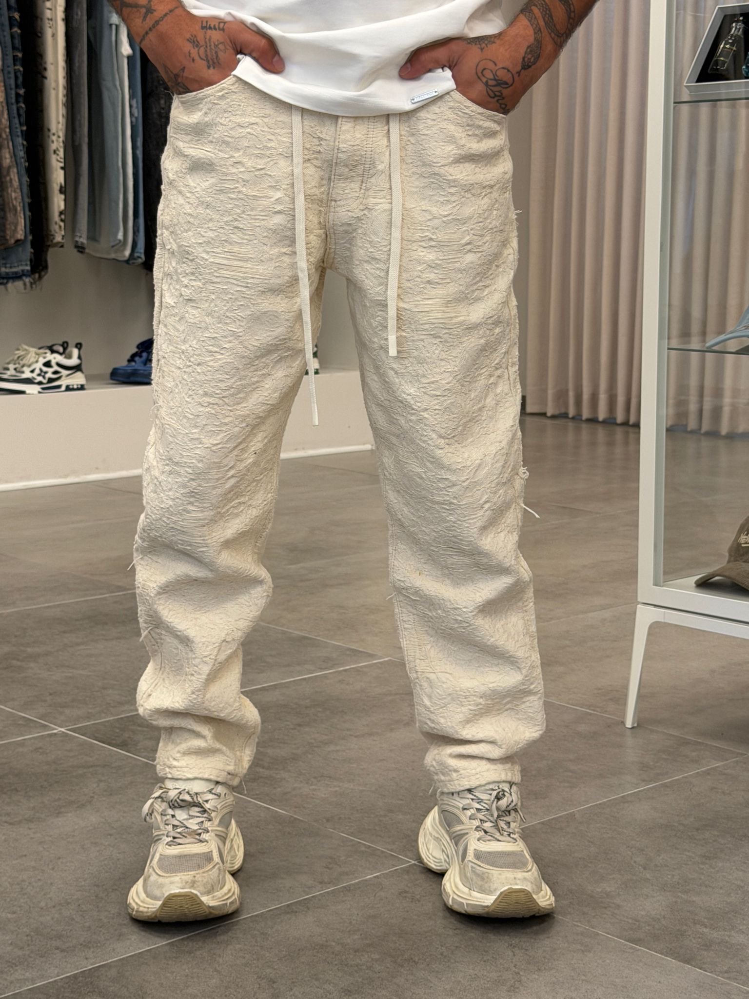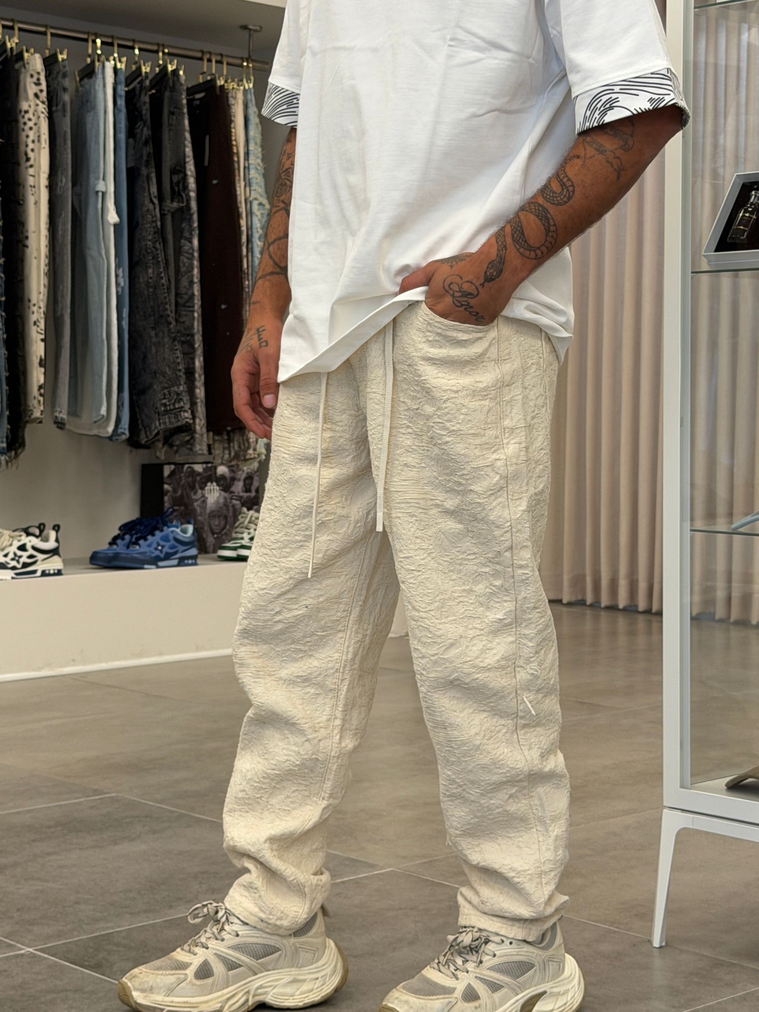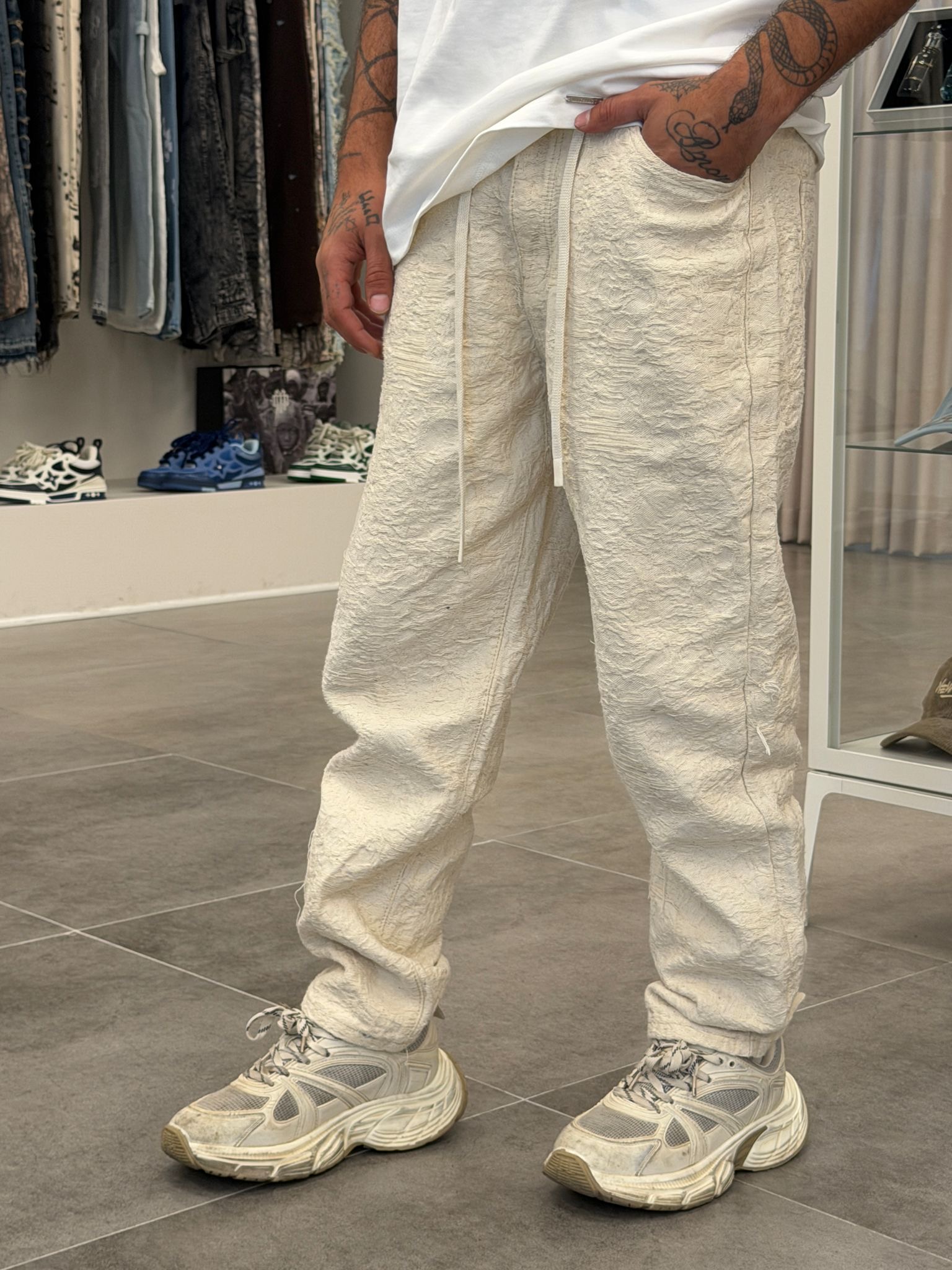 מכנסי אוברסייז בצבע קרם עם טקסטורה ייחודית בגימור תלת־ממדי, המעניקה מראה יוקרתי ומודרני.