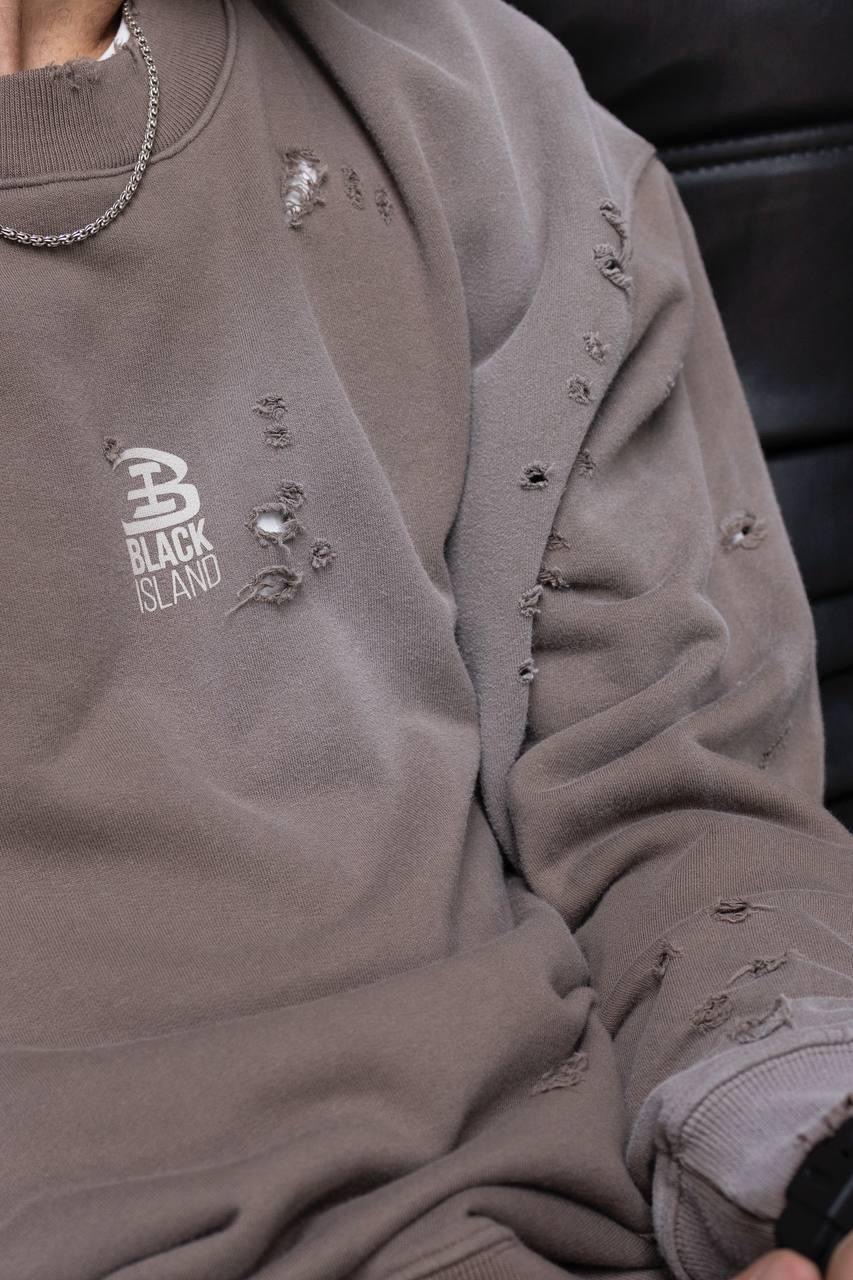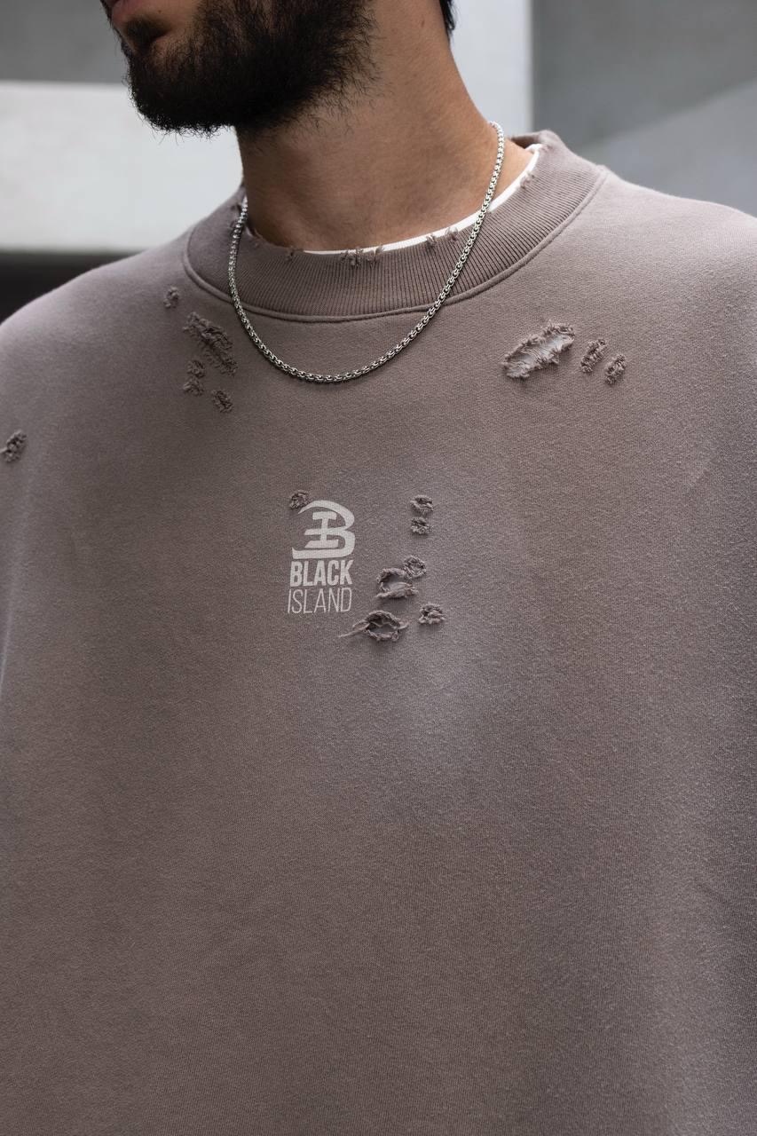 חולצת אוברסייז בצבע טופ מעושן, עם קרעים עדינים לכל אורכה ליצירת מראה distressed יוקרתי ואורבני.