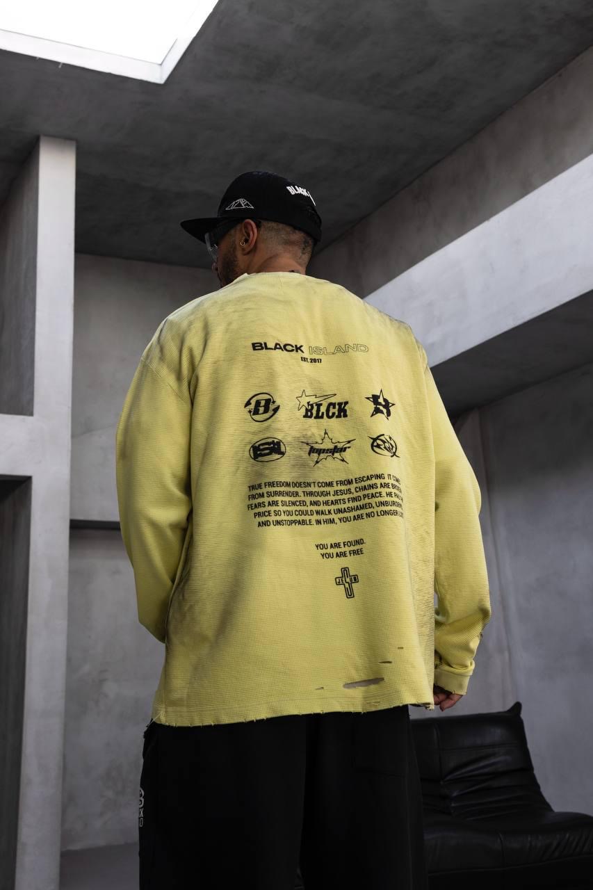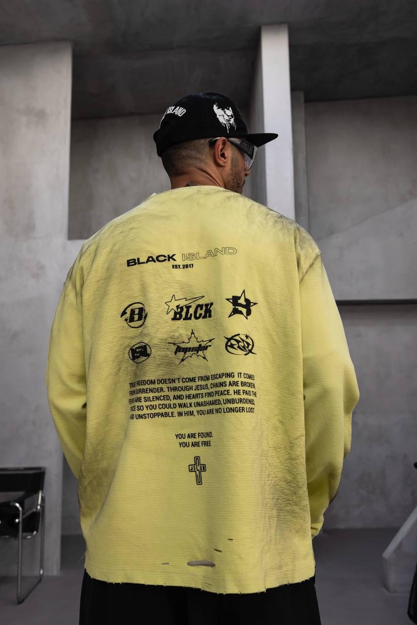 חולצת אוברסייז בצבע צהוב פסטל עם מראה דהוי ומלוכלך קלות בסגנון streetwear מודרני. עשויה מבד כותנה עבה ונושם, בגזרה רחבה ונוחה. החלק הקדמי מעוטר בהדפס גרפי של פה פתוח עם לוגו Black Island, ואילו בגב מופיעים הדפסי לוגואים מרובים יחד עם כיתוב השראה באנגלית וסמל צלב קטן בתחתית.